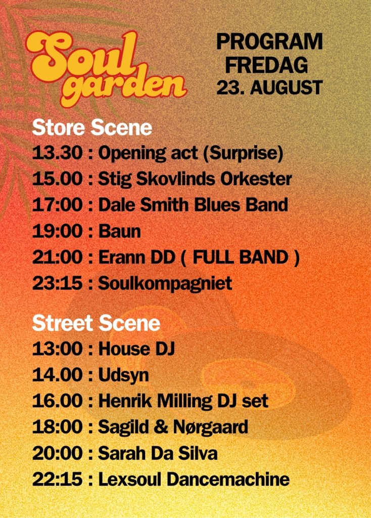 Soul-legender som Aretha Franklin, Stevie Wonder, Marvin Gaye og The Supremes, har man kun lov at drømme om at høre live – men så er det jo godt at der findes et band som Soulkompagniet, som er blandt landets bedste fortolkere af genrens største hits. Er man til det vildeste originale funk, går man ikke galt med Lexsoul Dancemachine fra Estland, som vi ved lidt af scoop får forbi i år. Pianisten Søren Baun kommer i år med sit fulde band Baun, som med sikkerhed vil fyre op under dansefødderne, og endelig må man ikke snyde sig selv for at opleve dansk-afrikanske Tarick der sidste år spillede på Roskilde Festival med sin forrygende afropop og hiphop, som i den grad vil selvantænde Soul Garden plæne.